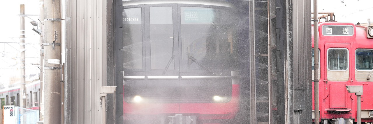 列車の美しさは、安全な運行のためにも欠かせません。クリアな視界が確保されてこそ、運転士は安全な運転に集中できます。一般には、なかなか目にすることのない、車両の外側をまるごと洗う様子をご紹介しましょう。