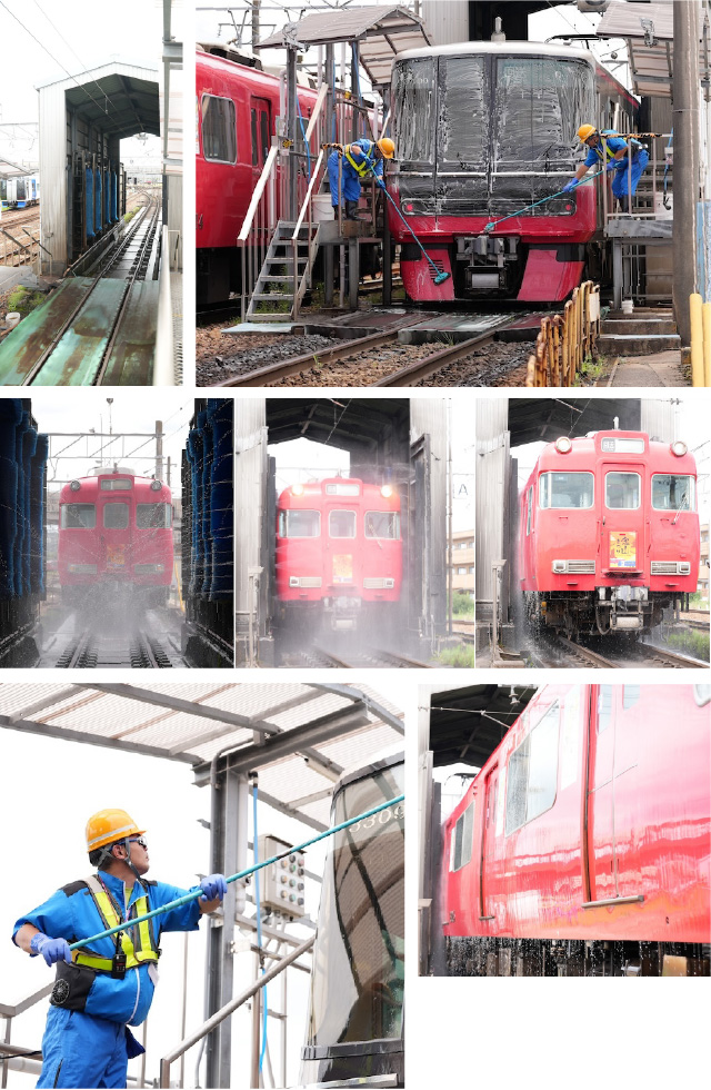 名鉄系の車両の美しさを支えいているのが、私たちが担っている「電車を洗って掃除をする」というお仕事です。沿線に配置されたいくつかの拠点を中心に、一日も欠くことなく清掃しています。主な整備場では、車両専用の洗車機もあります。社内ではシートも窓もひとつずつ、丁寧にクリーニングします。